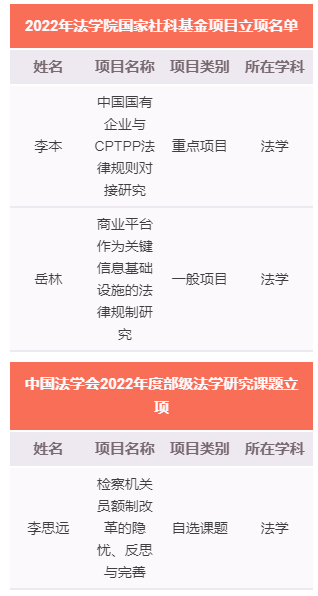 近日获悉,我院在2022年度国家社科基金项目立项和中国法学会2022年度部级法学研究课题立项中喜获佳绩,共有3个项目获得立项,获批重点项目1项、一般项目1项以及自选课题1项。本年度全校国家社科基金项目立项31项,我院在国家社科重点项目上实现突破,人均产出较高,多项国家级课题项目的立项进一步提升教师尤其是青年教师的科研积极性,为学院营造了更为浓厚的科研氛围,推动了学院科研水平不断提升。
