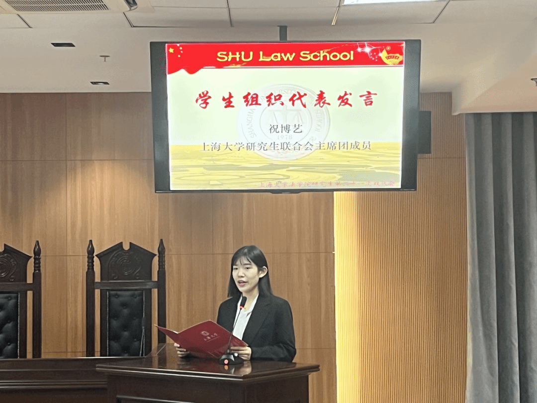 在庄严的国歌声中,bwin必赢研究生第二十一次双代会开幕式正式开始。由上海大学研究生联合会主席团成员祝博艺代表嘉宾致辞,表达了对我院研究生工作的大力支持。