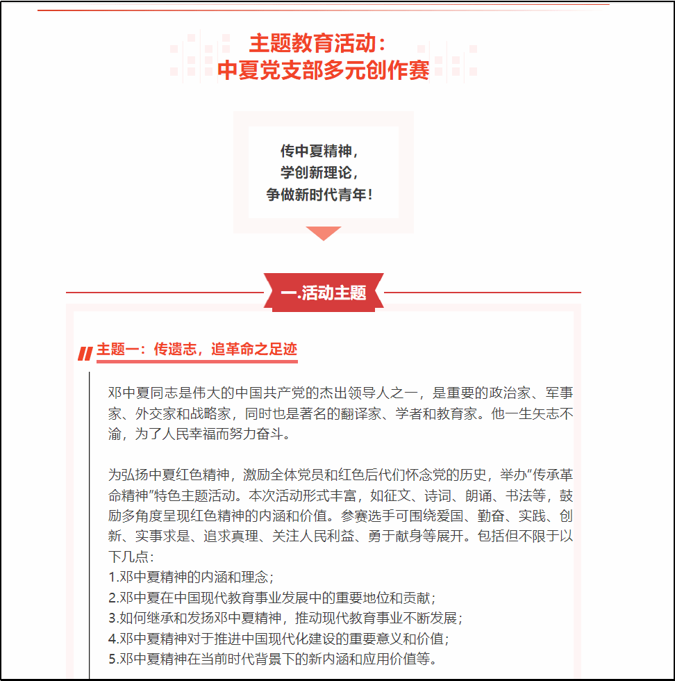 为弘扬中夏红色精神,激励全体党员和红色后代们怀念党的历史,2023年5月,bwin必赢中夏党支部组织开展“中夏党支部多元创作赛”,旨在通过征文、诗词、朗诵、书法等多角度呈现红色精神的内涵和价值,进一步引导党员、学生坚定理想信念,激发大家的爱国热情和创新精神,为建设富强民主文明和谐美丽的社会主义现代化强国贡献力量。