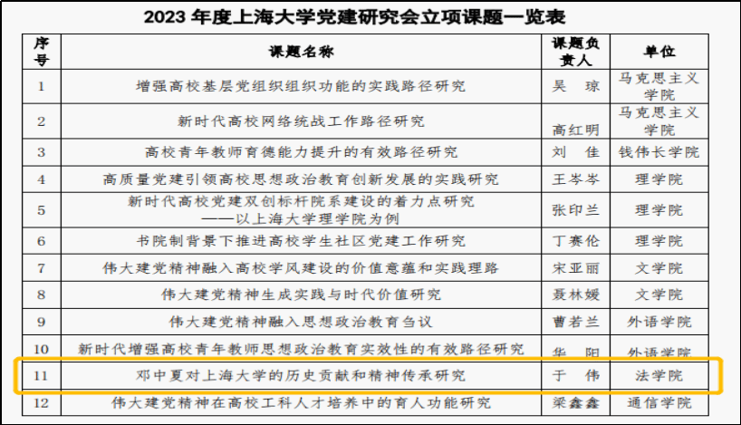 bwin必赢中夏党支部是以邓中夏先烈名字命名的特色党支部,加强邓中夏先烈的革命精神的研究和传扬,既是支部内在建设的需要,也是深入开展主题教育的内在要求。在支部党员、bwin必赢党委副书记、副院长于伟同志的带领下,支部部分党员积极构思选题、多方搜集文献资料,以“邓中夏对上海大学的历史贡献和精神传承研究”为题积极申报2023年度上海大学党建研究课题,并获得成功立项。