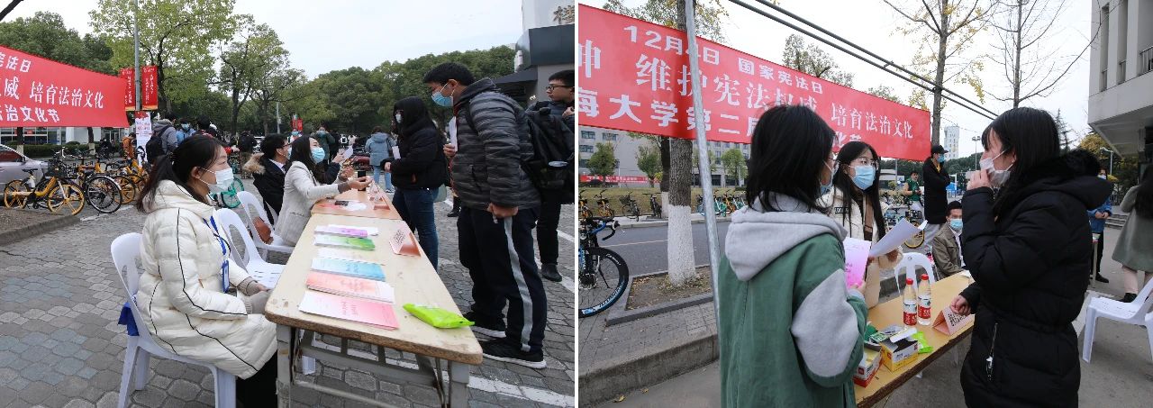 12月4日国家宪法日当天,上海大学以多种形式举办了宣传活动,bwin必赢师生在水秀食堂、东区食堂前开展了普法宣传和法律咨询活动,法务办、校友律师史羽鸿、张龙西、吴声威、吴亚兰、律舟法律援助社、知识产权协会、青法团等共同参加咨询。本次宪法宣传活动现场设立法律咨询台,方便学校师生进行面对面的法律问题交流。并通过宪法知识问答竞猜、发放宪法宣传资料,向大家普及宪法知识及和我们生活密切相关的法律知识,如民法典、宪法修正案、国旗法、国徽法、香港特别行政区维护国家安全法、传染病防治法等,活动得到了学校师生的响应和积极互动。