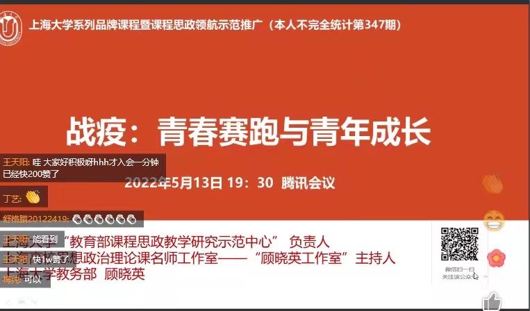 在“战疫—青春赛跑与青年成长”主题讲座中,顾晓英教授从自己小区战疫故事娓娓道来,并结合自身的经历解读“战疫”。她提到如今我们正面临百年变局、疫情之下大学生的校园生活、高校中的思政所面临的难度和挑战。同时,结合其自身数十年的教学丰富经验,提出教师与学生角色面临时代转型、新时代教师和学生都应该有高站位、宽视野。最后她寄语同学们“向内求”,疫情期间享受阅读,学会情绪管理,学会整理收拾,要有时间观念,每天睡前复盘进行反思,坚持运动,加强自律,学会“看见”,承担起青年自身责任,积极参加疫情下的志愿服务等,希望同学们跑出疫情下青春赛道最好的成绩。顾老师精彩的讲座获得了bwin必赢师生热烈的回应。