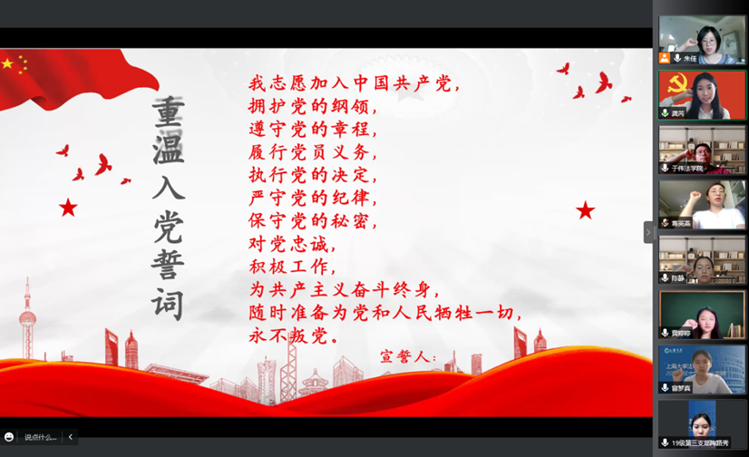 紧接着,王萌、黄婷婷同学作为本科和研究生毕业生党员代表作了交流分享。王萌同学提到,3月24日中国上海市委发布致全市共产党员一封信后,bwin必赢党员同志积极响应倡议精神,带头担起政治责任、带头发挥党员作用、带头联系服务群众、带头做好宣传引导,在未来的日子里也将不忘初心、砥砺前行。