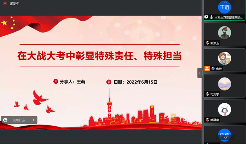 黄婷婷同学进行了“在大战大考中彰显特殊责任与特殊担当”的主题分享。在校园疫情防控中,不仅党员同学们积极参与到抗疫志愿中,学院领导、老师也无时无刻不在关心着同学们的身体和心理健康状况,为同学们准备大礼包、协调解决工作事务。在老师和同学们的共同努力下,校园疫情防控阻击战取得了阶段性胜利,让党旗高高飘扬在了疫情防控一线。她呼吁毕业生党员们,在未来的日子里继续带头发挥党员作用、服务群众、彰显担当,祝愿各位毕业生党员同志们毕业快乐。