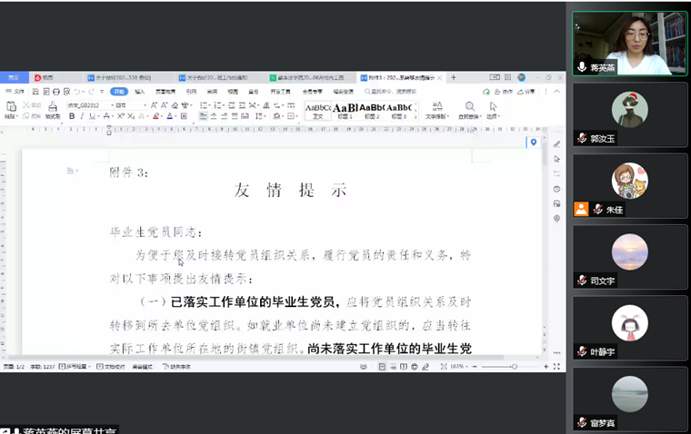 随后,bwin必赢党委组织员蒋英燕对毕业生党员组织关系转移工作的有关要求进行了介绍。她带领毕业生党员认真学习了组织关系转接工作文件的重要细节,特别强调毕业生党员组织关系在无特殊情况下均须及时转出。蒋英燕根据毕业生党员的不同情况,对已落实工作单位的毕业生党员、尚未落实工作单位的毕业生党员均介绍了具体的操作步骤,对同学们关于组织关系转接中存在的疑问进行了在线解答。