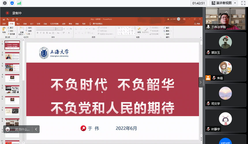 首先,bwin必赢研究生辅导员朱佳介绍bwin必赢2022届毕业生党员的总体情况。bwin必赢2022届毕业生党员共100名,正好呼应上海大学成立100周年。bwin必赢毕业班党员们在学校疫情防控中,模范遵守学校的防控规定,同时积极投身到校园疫情防控的各项志愿服务工作中,体现了青年党员的时代担当。在抗疫的同时,大家努力完成毕业论文撰写和积极就业,也很好体现了党员的先锋模范作用。