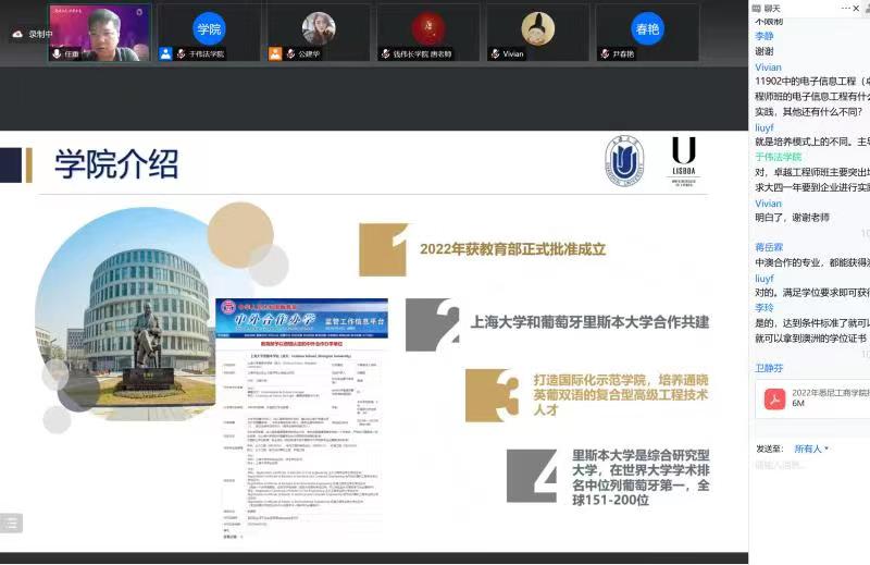 在特色学院介绍环节,上海大学悉尼工商学院学院党委副书记、副院长卫静芬从学院历史、学院优势、中澳合作的四大本科专业、人才培养、优秀学子等多个方面进行了介绍带来了全方面的介绍;上海大学中欧工程技术学院招生主管沈红分别从学院办学特色、学院培养模式、学生未来发展等多个方面进行了介绍;上海大学里斯本学院副院长任重分别从学院介绍、培养特色、本科专业介绍、学生未来深造等多个方面给在线的考生和家长带来了详细的介绍。
